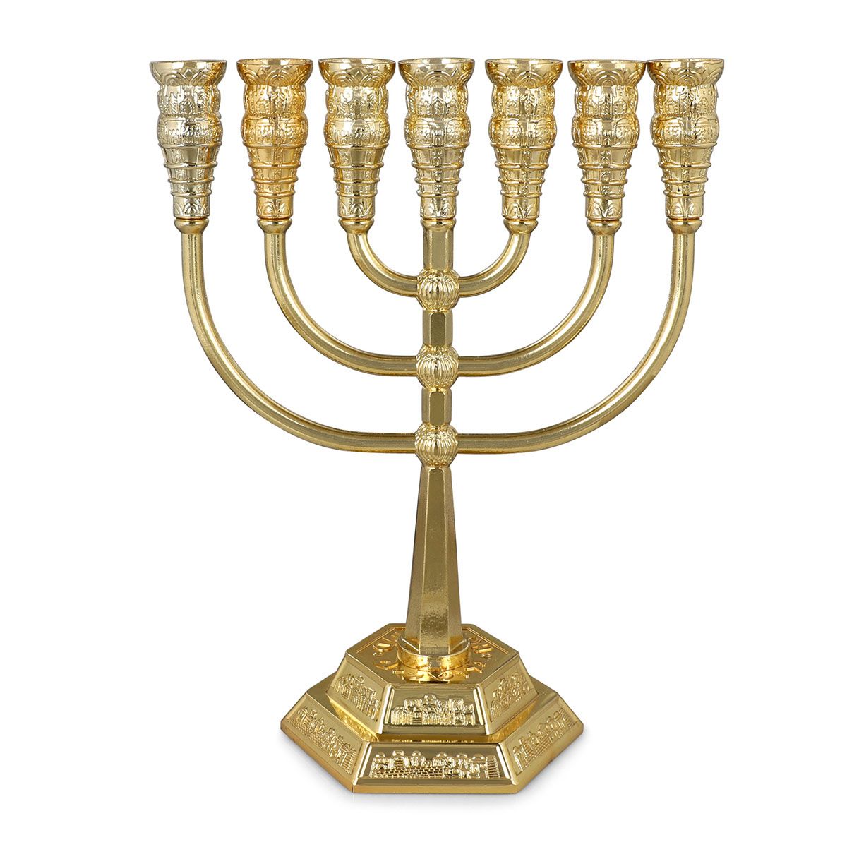One of our most popular 7-branched menorahs is this majestic piece inspired by the menorah that stood in the Holy Temple, with decorative representations of the city of Jerusalem added to the base. Whether you prefer the gold- or silver-plated options, you'll love honoring Jewish history and ancient ritual in style. It will be a poignant and meaningful Jewish symbol in your home, straight from the Land of Israel!