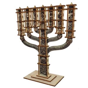 A slightly different take on the classic Jewish symbol, this 7-branched menorah is actually a puzzle based on the majestic menorah that stands in front of the Israeli Knesset (Parliament) building in Jerusalem today. Fun for kids and adults alike, once the laser-cut wooden pieces are assembled this menorah will stand tall and proud as a beautiful piece of decoration for the home or workplace. Keep your kids' minds active while getting them in touch with their Jewish history in an exciting way. This unique menorah also makes a great holiday gift!