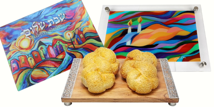 This glass challah tray encapsulates the feeling of Shabbat, with its colorful image of two lit candles lit and a braided challah loaf. Designed by acclaimed Jerusalem-based contemporary artist Jordana Klein, this challah tray is sure to impress your family and guests every time you use it on Shabbat or a holiday.