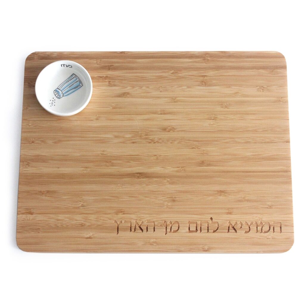 For lovers of modern Israeli design, this two-piece Shabbat set doesn't disappoint! It includes a bamboo wood challah board that's engraved with the Hebrew words of the traditional blessing for bread, along with a small porcelain bowl painted with an image of a salt shaker and the Hebrew word for salt. A great gift for a housewarming, wedding, or Mother's Day!