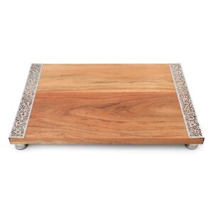 Add a touch of artistry to your Shabbat table with this beautiful challah board by renowned Israeli artist Yair Emanuel. Crafted from wood, it features cut-out metal decorations on each end, showcasing a stunning pomegranate motif and the words "Shabbat Shalom" in Hebrew. A perfect addition to your table, combining elegance and tradition.