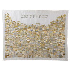 Bring the Holy City of Jerusalem to your Shabbat table with this stunning cover for your challah! Hailing from Yair Emanuel's studio, it's expertly embroidered with a gorgeous depiction of Jerusalem, including its famous arches and walls, and accented with glittering gold thread. Above Jerusalem's skyline are the words "Shabbat VeYom Tov" ("Shabbat and Holiday") embroidered in silver thread for an extra-special touch that you or your lucky gift recipient will appreciate.