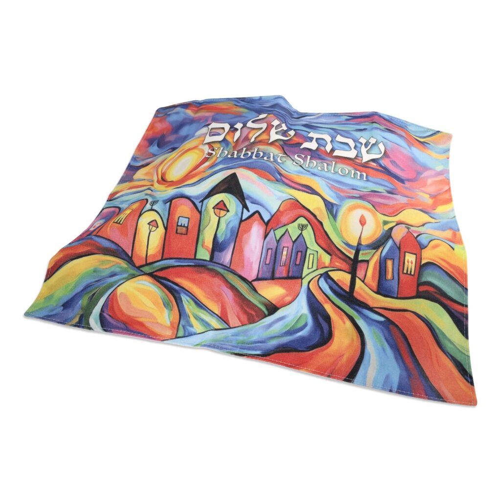 This breathtaking challah cover is made to match the previous challah board above, but will look amazing no matter what tray you have. Printed on a washable, microfiber cloth, this design almost looks painted on, colorful and traditional at the same time. Bring the beauty of Shabbat into your home like never before!