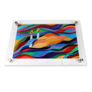 This glass challah tray encapsulates the feeling of Shabbat, with its colorful image of two lit candles lit and a braided challah loaf. Designed by acclaimed Jerusalem-based contemporary artist Jordana Klein, this challah tray is sure to impress your family and guests every time you use it on Shabbat or a holiday.