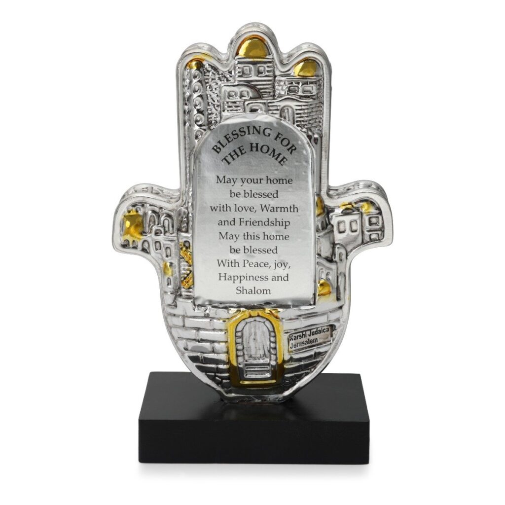 Hamsa-shaped house blessings are particularly common in the Land of Israel, combining two powerful Jewish themes: the ancient protective amulet of the Hamsa and the positivity and good wishes of the home blessing. And you can't go wrong with this silver-plated Jerusalem Hamsa house blessing from Israeli artisan workshop Lion of Judah Studio! Designed in gleaming silver with gold accents, the piece beautifully showcases a detailed Jerusalem cityscape, complete with silver synagogues, golden rooftops, and intricate framing. At its heart, a meaningful Birkat HaBayit (Blessing for the Home) is inscribed, offering wishes of peace, joy, and divine protection.