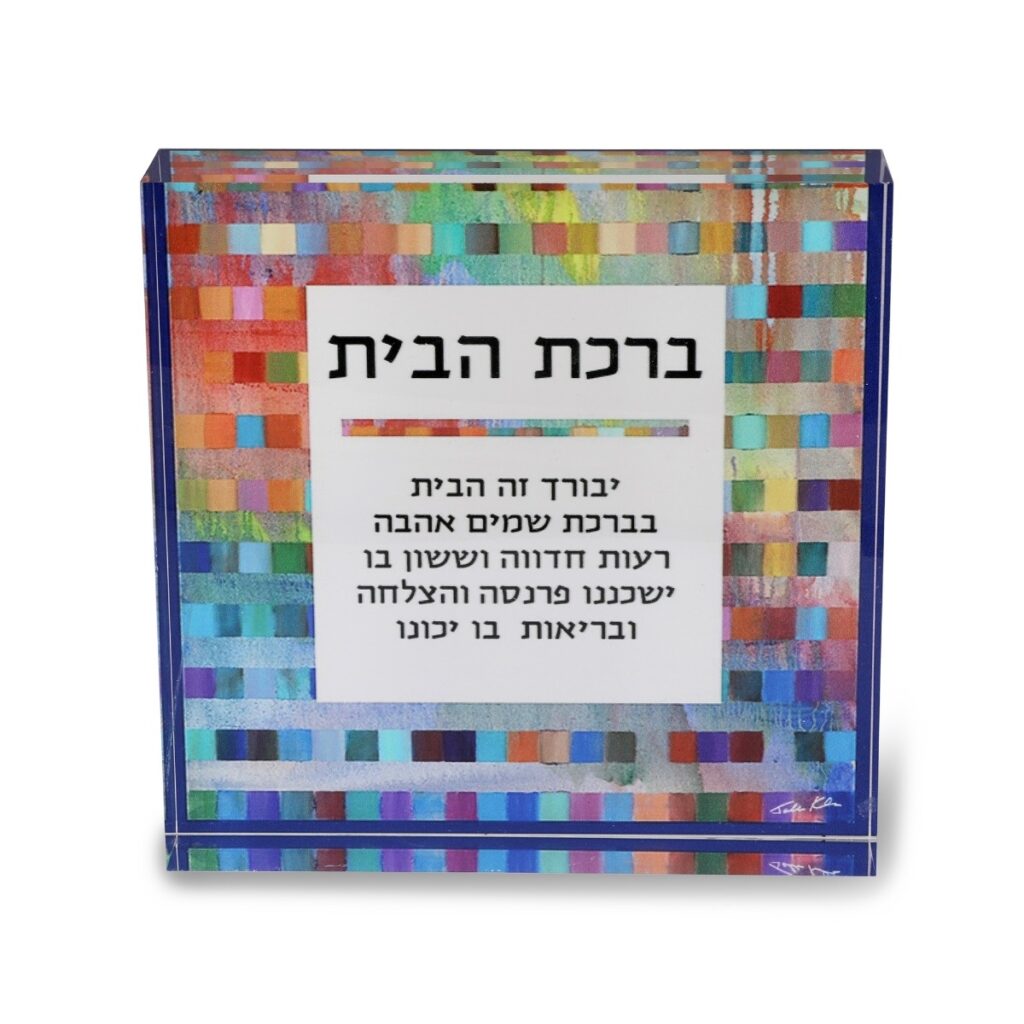 Coming from Jerusalemite artist Jordana Klein, famous for combining traditional Jewish themes with bold colors and modern designs, is this home blessing ornamental glass cube. It features a traditional Hebrew home blessing set against a multicolored abstract square design, and is available in a choice of sizes. This handmade piece straight from Israel is sure to be an unforgettable gift this holiday season!