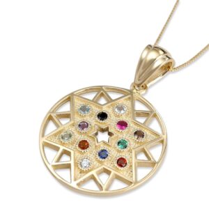 This arabesque style pendant has a Star of David motif along with 12 gemstones around the star inspired by the hoshen breastplate worn by the high priests. Within the circular, 14K gold outer ring are two overlapping 6-pointed stars, along with space at the center in the shape of the Magen David. This is a great present for a wedding.