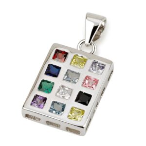This stunning, sterling silver hoshen breastplate pendant is a striking yet traditional style. The minimalist design allows for the brightness of the colored gems to come through clearly, alluding to the 12 Tribes, and what the High Priest used to make prophetic judgement. This pendant can be worn with just about any outfit, and would make for a fantastic bat mitzvah present.