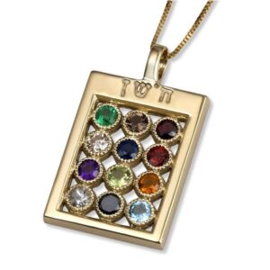 The hoshen is the breastplate that was worn by the Cohen Gadol, the high priest, to interpret prophesy, but with this necklace, you can see already that it would go well with any outfit. Made from 14K gold, this shows the word "choshen" in Hebrew letters above 12 gem stones reminiscent of the breastplate.