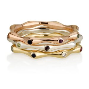 This ring, made up of 3 rings that fit snugly together, each inlaid with different colored gems within the wave pattern along the outside. These rings are made from silver, yellow gold, and rose gold, adding even more color and beauty to this highly customizable set. Wear just one or all three together to go along with any outfit.