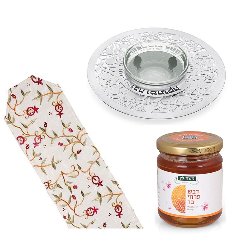 A perfect Rosh Hashanah gift from Lin's Farm and Yair Emanuel, this Rosh Hashanah gift set includes a jar of pure wildflower honey, raw silk table runner, as well as an ornate glass apple-shaped honey dish with honey wand, making it easier than ever to serve apples and honey at your Rosh Hashanah dinner to guests of all ages.