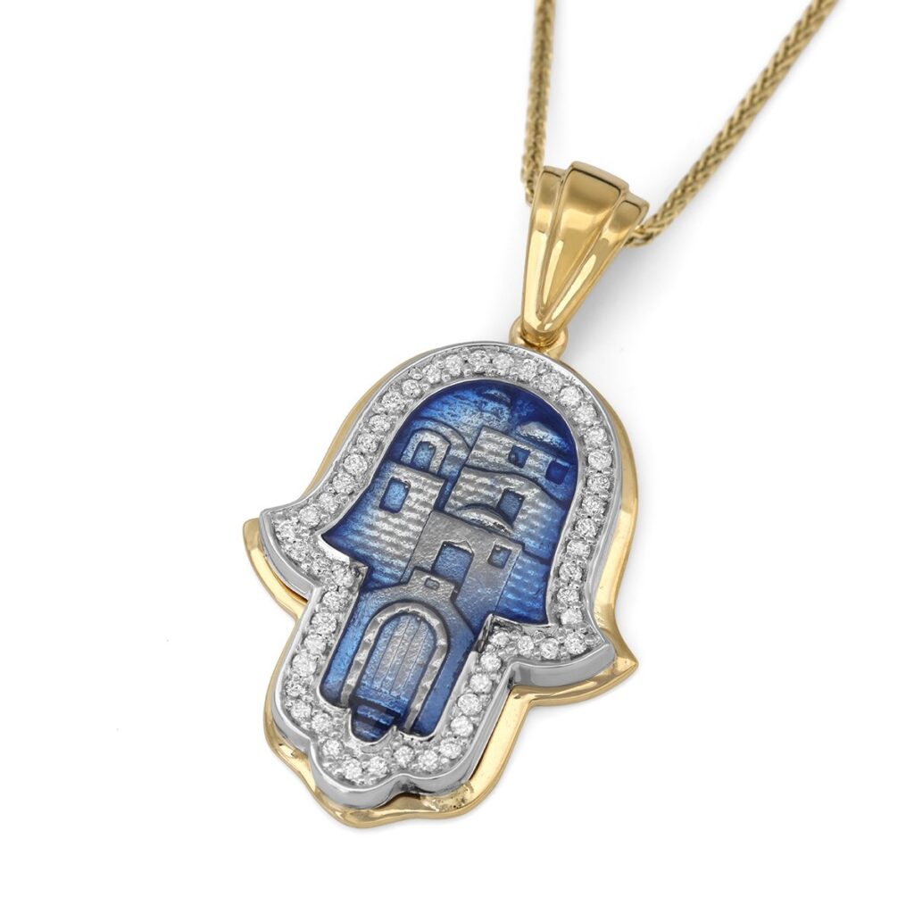 Carry the Holy City close to your heart wherever you go with this special Hamsa necklace that incorporates Jerusalem into its dazzling design. The center contains a breathtaking view of the Jerusalem skyline in a transparent, blue enamel for an awe-inspiring finish. This remarkable necklace is available in yellow or white gold and make an eye-catching addition to your jewelry collection.