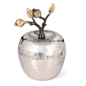 Many families have the tradition to use honey or date syrup for dipping both apples and bread to kick off the year to a sweet start. This designer honey dish is a great way to hold your sweet of choice. It comes with the apple made of steel, copper pomegranates on the lid, and a clear glass bowl inside. To help with serving, it also comes with a similarly styled spoon shaped like a tree branch with leaves.