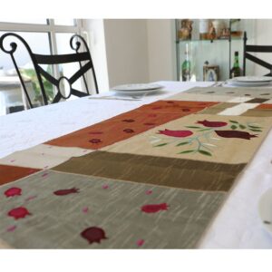 Tie your holiday table all together with a colorful yet elegant holiday motif, with this raw silk pomegranate table runner. An original piece by one of Israel's leading artists, Yair Emanuel, this vibrant table runner features a unique paneled design along with delicately embroidered pomegranates. Choose the right size for your table, and wow your family and guests with its eye-catching and festive look this Rosh Hashanah, and for many holidays to come!
