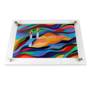 Hand-made by Israeli artist Jordana Klein in her Jerusalem studio, this large glass challah tray features an artistic blend of colors surrounding a loaf of challah and Shabbat candles. This tray is perfect for hosts and young couples who are still building their Judaica collection. In addition to providing a durable and beautiful place for the challah at your Rosh Hashanah table, this gorgeous tray can also be used on Shabbat, as well as displayed as a work of art in your home year-round.