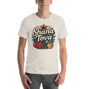 In this playful T-shirt you will be the life of the Rosh HaShanah seder or any other gathering. Something sporty like this shirt will let everyone know you want them to have a good year! It features the words Shana Tova (A good year), a common statement that everyone wishes one another, as well as Shanah Tovah U'Metukah (A sweet and good year) in Hebrew writing. When it comes to Rosh HaShanah, there are no limits to how much good there can be!