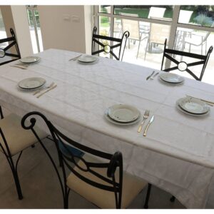 This lovely white tablecloth comes in an array of sizes and is perfect for Rosh Hashanah celebrations and Shabbat alike. Designed in Israel, the tablecloth is decorated with various designs, including the Star of David, a Kiddush cup surrounded by Shabbat candlesticks, a floral motif and the Hebrew words "Shabbat Kodesh" (Holy Sabbath) and "Moadim Lesimcha" (A Happy Festival). It's also kid-proof and spill-proof; it is machine washable and stain resistant, so it's built to last for years to come!