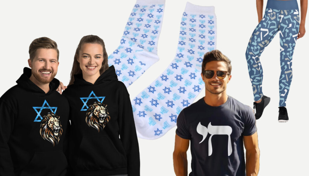 ✡ Check out our Lion of Judah and Star of David Unisex Hoodie, cozy Star of David and Menorah Socks, bold Chai Jewish T-Shirt, and our newest, just-arrived Hebrew Letters Yoga Leggings.