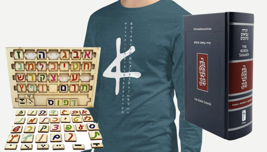 ✡ Check out this Hebrew Alphabet Interactive Educational Puzzle for new Hebrew learners of all ages, this Biblical Hebrew Alphabet Unisex Long-Sleeve Tee displaying the modern and ancient Hebrew alphabets, and this magnificent Hebrew-English Bible (Tanach) from acclaimed publisher Koren Jerusalem.