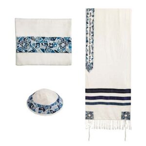 If you're looking to upgrade your tallit set that matches, or you're shopping for a soon-to-be Bar Mitzvah, then this set from Yair Emanuel is a great choice. It is made up of a kippah, a tallit and a tallit bag, all with the same cubist-style Star of David, in hues of blue. This is a great opportunity to have a cohesive set for Shabbat or during the week.