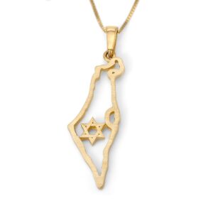 Shopping for a woman who keeps Israel close at heart? This map of Israel pendant, available in yellow or white gold, is a beautiful memento of a trip to Israel, or simply pride in the Jewish nation. It shows the lakes of Israel: the Galilee and the Dead Sea, and has a Star of David placed in the middle of the design. It is sleek, elegant, and can be worn with a wide variety of styles in mind. This would be a great Bat Mitzvah present, and your wife will like it too.