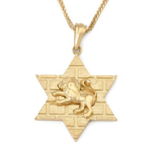 14K Gold Star of David Pendant with Lion of Judah and Western Wall Motif