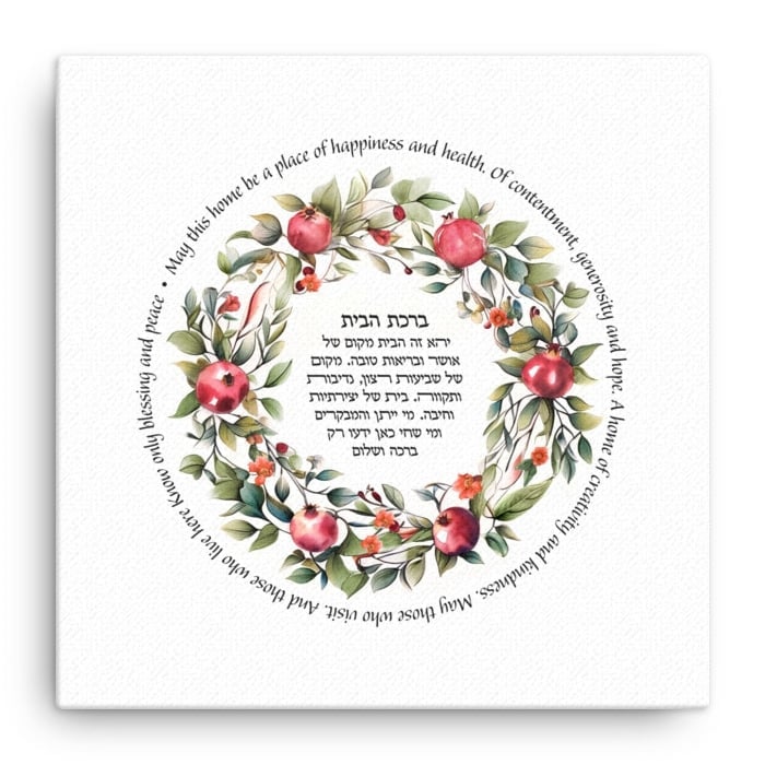 This striking pomegranate-based blessing wall art is made out of canvas and features a short but poignant message in the style of a traditional Hebrew home blessing for the home to be a place of happiness, health, contentment, generosity, hope, creativity, and kindness. It's perfect for setting the atmosphere in your home or that of someone receiving it as a gift. This piece is just one of many amazing products from Modern Shtetl's Home Decor.