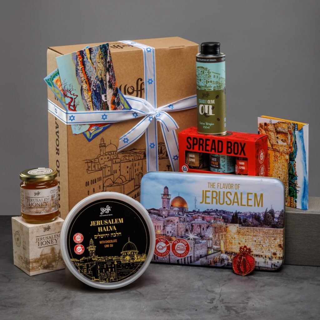 ❤︎ We love this Jerusalem-themed gift basket from Yoffi and this "Savion" gift box from Lin's Farm with olive oil and sweet spreads.