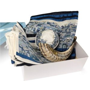 This incredible Judaica gift set will be beloved by any man, right in time for Rosh Hashanah. This matching set with a tallit, tallit bag, kippah, and shofar is truly the full package when it comes to the Jewish New Year. The shofar is a simple, elegant ram's horn, while the rest of the items are embroidered with a blue Old City of Jerusalem motif that is vibrant yet elegant. Your father will love this coordinated set for Rosh Hashanah, and will treasure it for years to come!