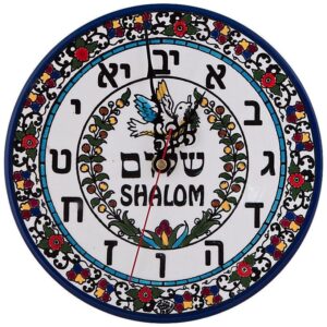 This intricate, striking piece of Armenian ceramic design is truly a work of art. The colors and elaborate imagery are captivating and at the center is a dove with an olive branch and the word "Shalom" in Hebrew and English lettering. Around the face of the clock are Hebrew letters as digits, and all of the rings of decoration contain a distinctive blue border, typical or Armenian ceramic art that developed in Jerusalem.