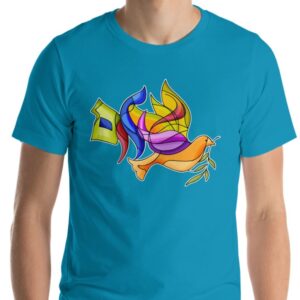 This shalom shirt greets anyone you pass by while adorned with a cool design on the Hebrew word Shalom. The letter Shin is depected as a dove flying, carrying an olive branch. The rest of the letters are in a stain-gass color style, and wavy like smoke. No matter what your style is, you'll find an option perfect for you, available in six colors. Wherever you're going, this is a great choice.
