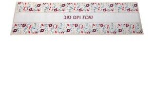 This fun and vibrant table runner is a great way to add some excitement and color to any family meal. With "Shabbat v'Yom Tov" (Shabbat and holidays) running through the middle and a red, purple, and blue pomegranate motif running down the sides. It's heat resistant and easy to clean, making this runner very family friendly for those with kids, who will love this pattern.
