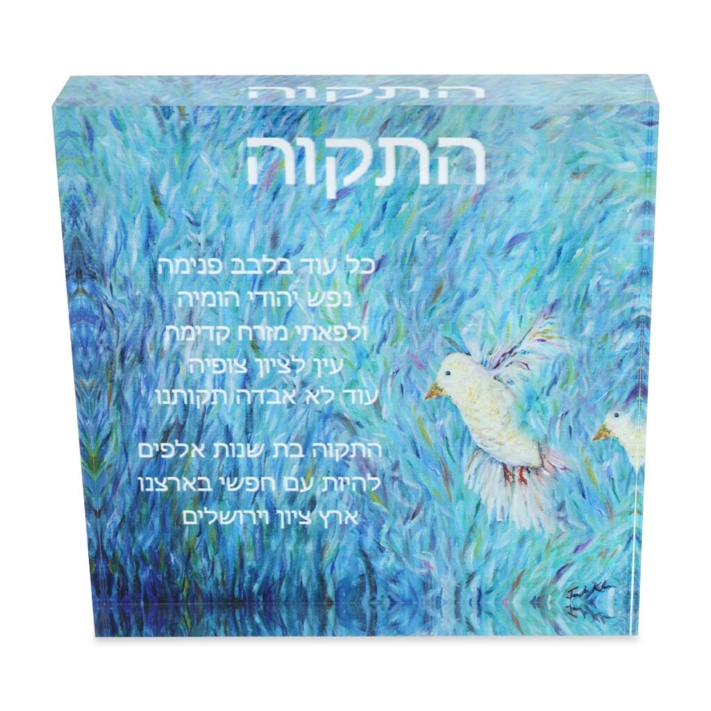 This ornamental glass cube speaks to the Jewish soul and its special connection to the Land of Israel by featuring the poignant lyrics of the famous song "Hatikva" that eventually became Israel's national anthem. The Hebrew text of the song is accompanied by the word "Hatikva" ("The Hope") on top and two doves, with a painted blue background. Don't miss out on this meaningful work of art!