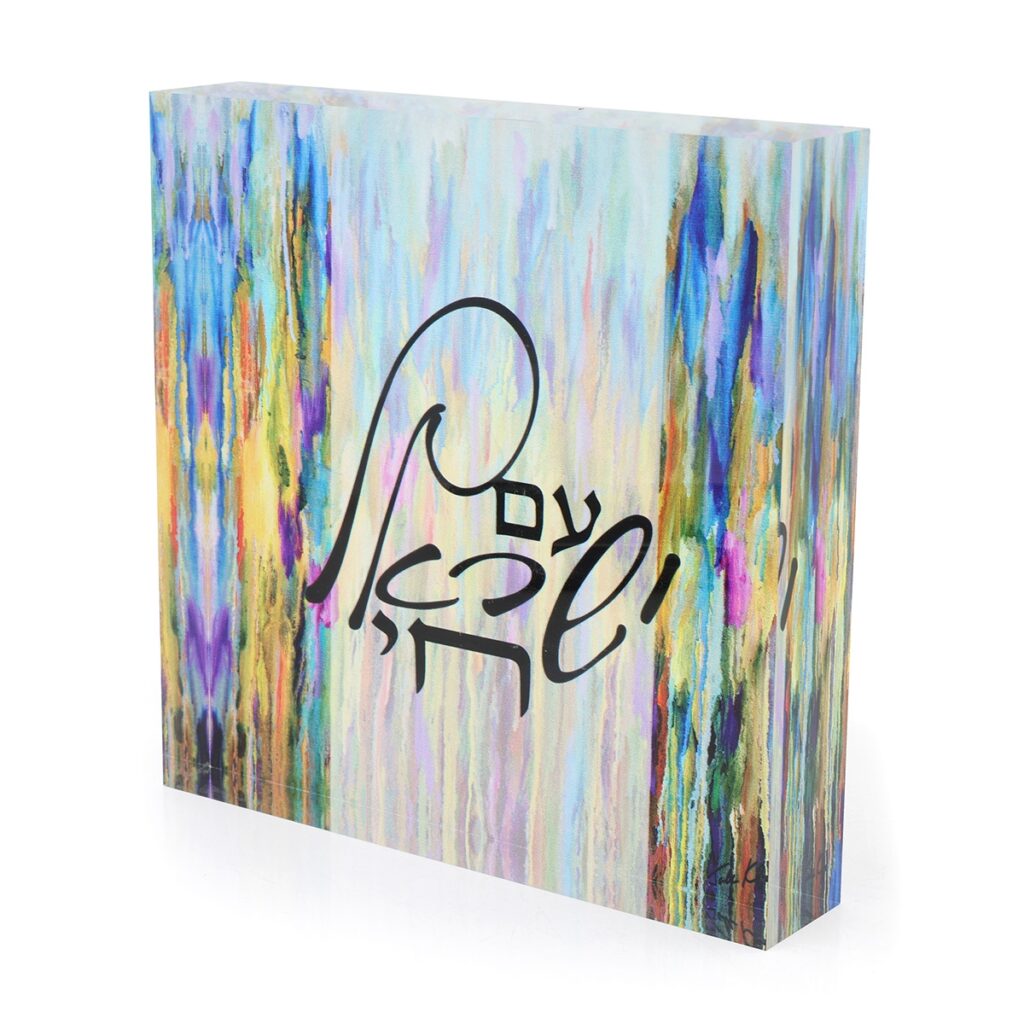 Express your Jewish pride with the famous slogan of Jewish strength and resilience, "Am Yisrael Chai" ("The People of Israel Live"), on this decorative glass cube! Jordana Klein created this special piece after the attacks of October 7th, 2023, as a show of Jewish defiance that can be displayed in any home. Featuring the famous phrase in a stylish Hebrew script against a colorful backdrop, the cube comes in a choice of sizes and makes for an unforgettable gift.