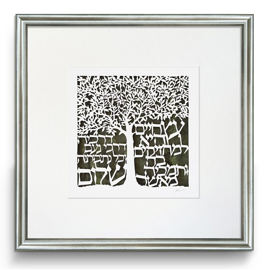 We're rounding out our list of wonderful Tree of Life-themed finds with this lovely piece of papercut art made right in Jerusalem by artist David Fisher. Made from laser-cut paper in a range of color options, it features a Tree of Life motif surrounded by the Hebrew verse "Eitz chayim hi lamahazikim ba, vetomcheiha meushar" ("It is a tree of life for those who hold it, and all who support it are happy") from the Book of Proverbs. An elegant gold or silver frame is also available at an extra cost, to make it a truly outstanding piece of Israeli home decor.
