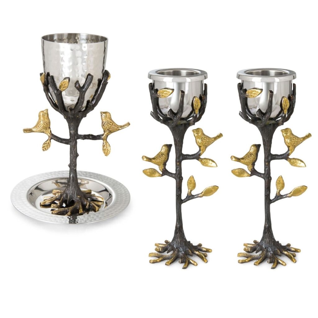 Add Tree of Life symbolism to your Shabbat and holiday celebrations with this coordinated Judaica set from famous Jerusalem artist Yair Emanuel! It includes a Kiddush cup with saucer and matching Shabbat candlesticks, each crafted to resemble a tree with gold-colored birds and leaves. The set comes packed in a lovely gift box, so it also makes for a thoughtful holiday or housewarming present.