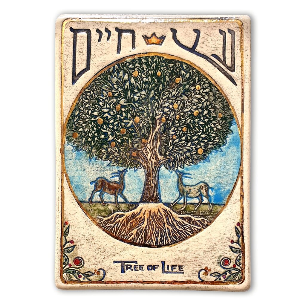We can't get enough of intricately-painted Tree of Life art from Art in Clay studio, and this stunning piece is a real must-have! Masterfully handcrafted from ceramic, this plaque boasts a gorgeous design of two gazelles gleefully grazing at the base of a Tree of Life, along with the Hebrew words "Etz Chaim" on top and the English translation "Tree of Life" along the bottom. Both beautiful and meaningful, this piece of Jewish artwork will make a fantastic addition to any room in your home or office!