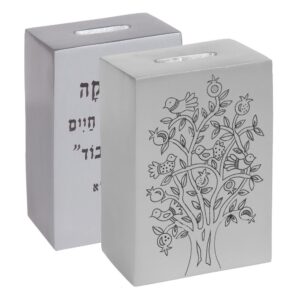 Tree of Life silhouette on the front and 'tzedakah' spelled out in Hebrew down the side of this colorful metal box are the perfect blend of tradition and modernism. In a wide range of nine colors, these tzedakah boxes are extremely customizable, so you can fit them into any style at home or to give as a highly personalized gift. The velvet lining prevents any coins you put in from clanging around as well, which might be a relief if gifted to an energetic child, to instill good Jewish values early.